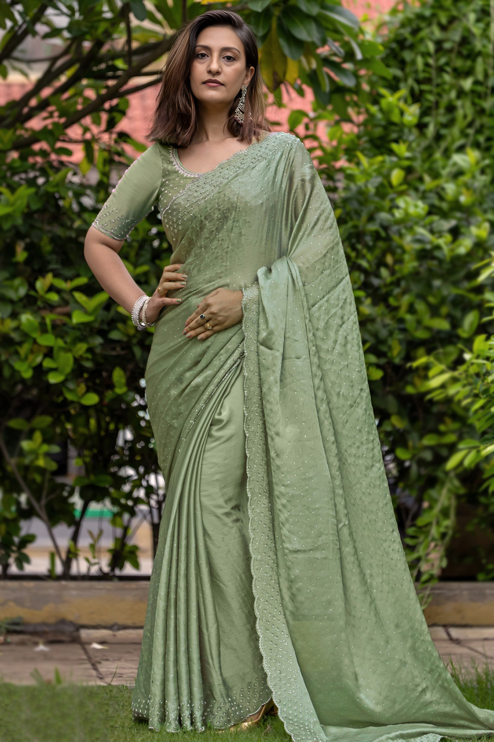 Dusty Green Chiffon Stone Embellished Light Weight Saree